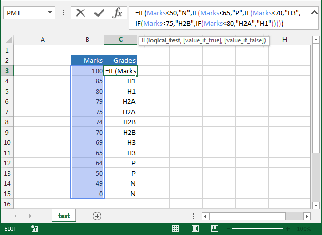=IF(Marks<50,"N",IF(Marks<65,"P",IF(Marks<70,"H3",IF(Marks<75,"H2B",IF(Marks<80,"H2A","H1")))))