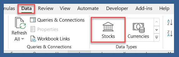 To display up-to-date stock data, we use the Stocks DataType available on the Data tab (Fig 5). The Stocks fields lists include: 52 week high, 52 week low, Beta, Change. Change (%),Currency, Description, Employees, Exchange, Exchange abbreviation, Headquarters, High, Industry, Instrument Type, Last trade time, Low, Market cap, Name, Official name, Open, P/E, Previous close, Price, Shares outstanding, Ticker symbol, Volume, Volume average, and Year incorporated.