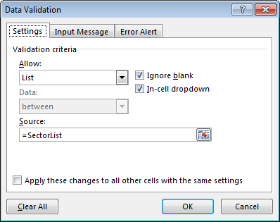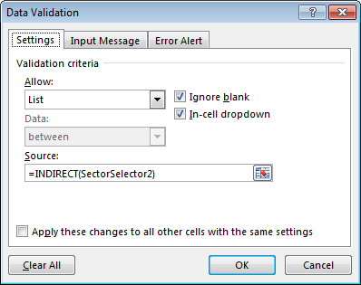 Data validation uses Allow: List, Sources items as shown in figures 2, 3, and 4. Note the use of the INDIRECT function (figures 3 and 4) with the text references in SectorSelector1 and SectorSelector2.