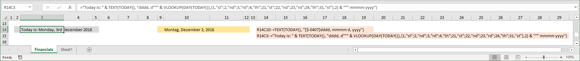 ="Today is: " & TEXT(TODAY(), "dddd, d""" & VLOOKUP(DAY(TODAY()),{1,"st";2,"nd";3,"rd";4,"th";21,"st";22,"nd";23,"rd";24,"th";31,"st"},2) & """ mmmm yyyy")