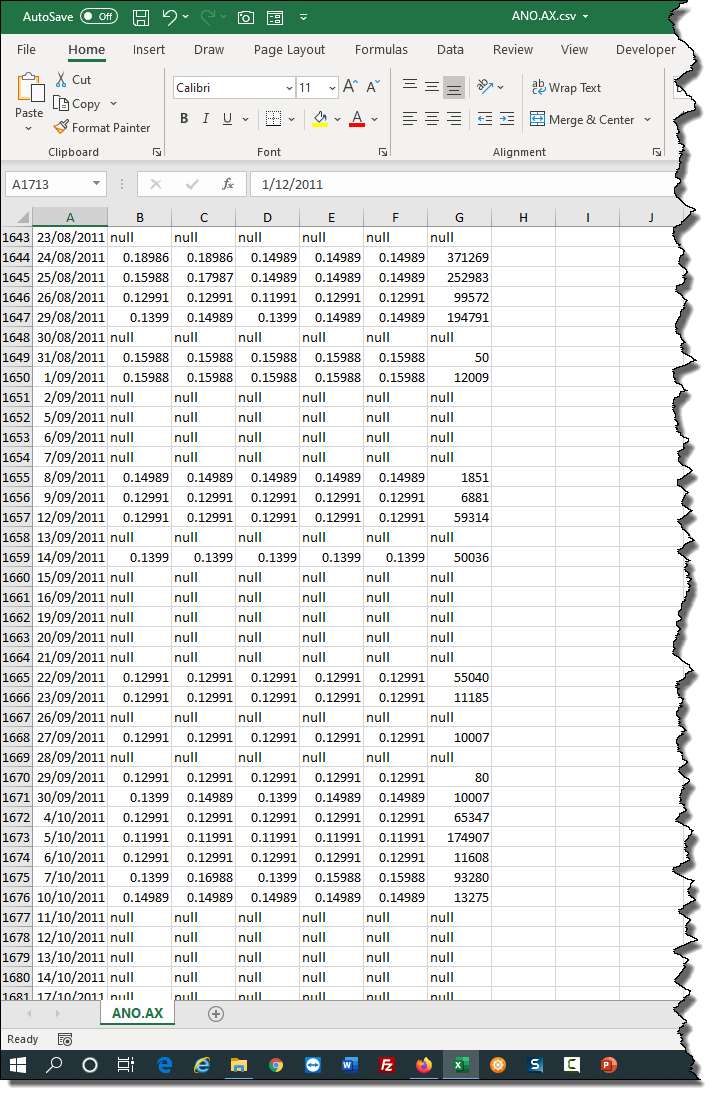 Advance Nanotek Limited (ANO.AX) data for 2011 has numerous null records (see figure 5). A quick examination of ASX charts suggest that ANO stocks did not trade on these dates.