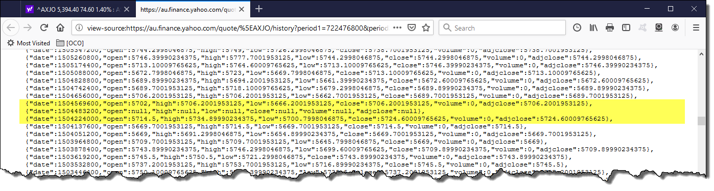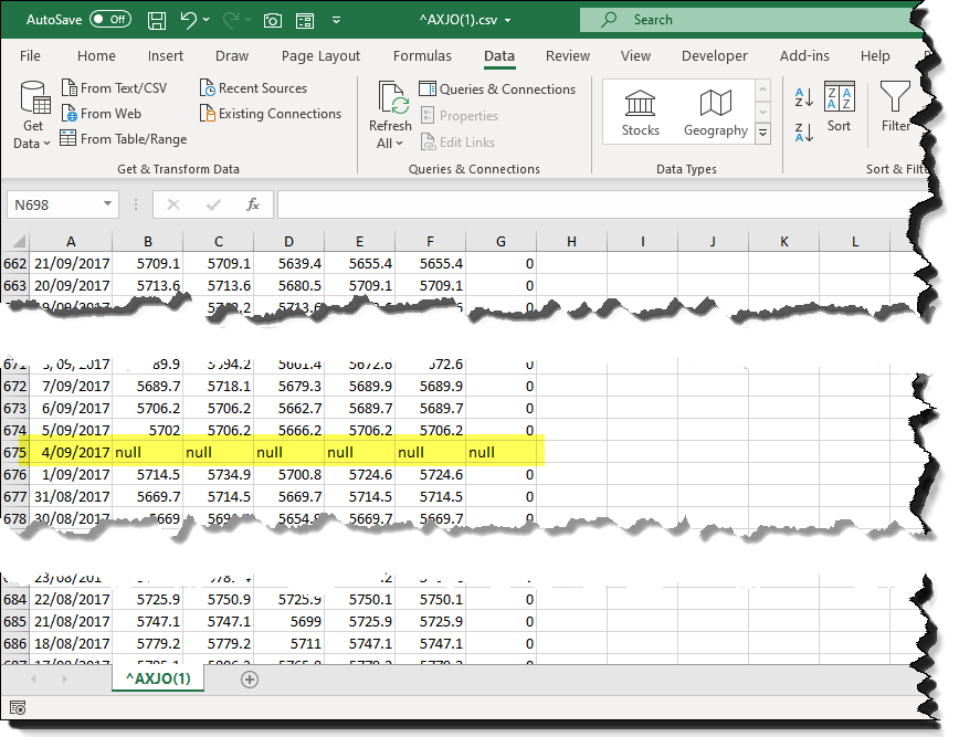 Database NULL values usually mean that the data is missing, unknown, or not available. Yahoo historical data sometimes includes a valid date, but a series of fields containing null. An example is AXJO.AX (the S&P/ASX 200 index - an Australian stock index) as shown in figure 1, worksheet line 675 for 4 September 2017. Null fields are more frequent in stock price data prior to 2012, see figure 4.