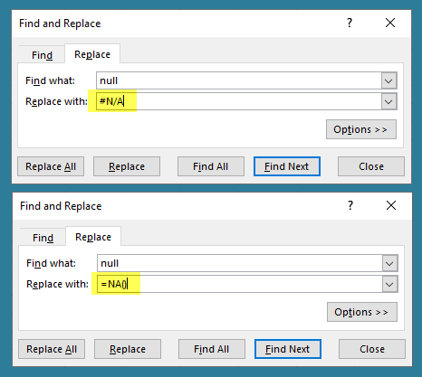 - Then replace null with string "#N/A" or formula =NA(). These statements are equivalent, figure 4.